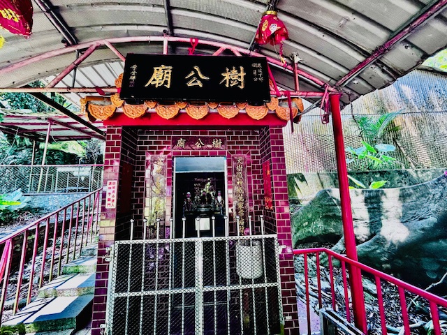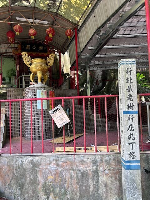 來到近處,遠遠可見一個棚架後枝葉碧綠、亭亭如蓋的巨樹,正是我們要尋訪的九丁榕。樹前一個白色石柱的正面寫著「新北最老樹 | 新店九丁榕」,側面則是「千年老樹 樹高25公尺」,據專家研判,即使沒有千年,最少也有數百年。當地信眾在樹旁建了一座「樹公廟」,神龕裡坐在中位的神像應是樹公爺,而兩旁則為土地公和土地婆。
