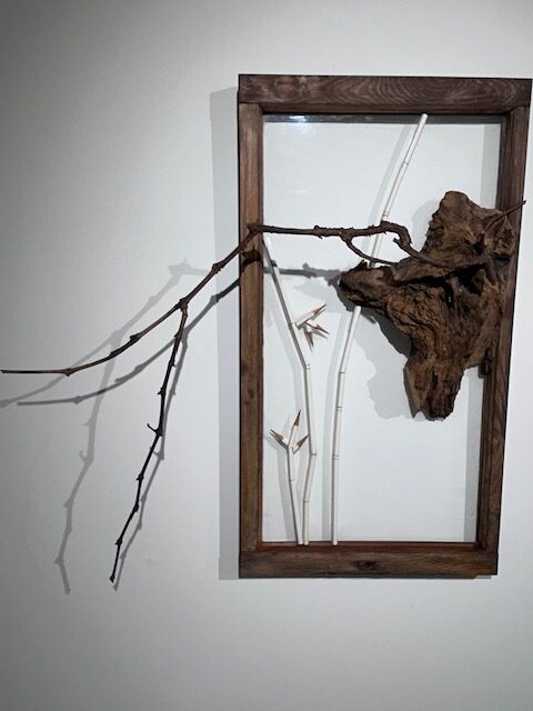 我對那兩幅由枯木和枯枝所構成的立體山水作品特別有感,而和妻子在作品前留影。《聊齋》裡的書生在觀畫時為之神往,而進入畫中世界;我觀賞馨文的山水,作品裡的枯枝忽然闖進現實世界,讓受到刺激的我忽然覺得自己好像成了枯枝上的一個什麼。