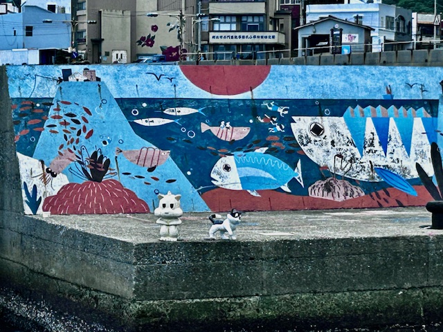 下到漁港的停車場,發現有幾位釣客就在港邊垂釣,不大的漁港內除了左前方繫著一艘小遊艇外,沒有半艘船,港邊的海巡單位也早已人去樓空。但長方形內港區的堤防上卻有一些跟海洋與海洋生物有關的壁畫,而且感覺還很新。堤防走道的角落居然還站著一隻狗和一隻貓(雕塑),望著內港似在發表什麼看法。對岸的港邊走道上另有一件立體雕塑:一隻可愛的萌貓雙手捧著一條魚站在一艘小船上,船艙裡堆著滿滿的魚。