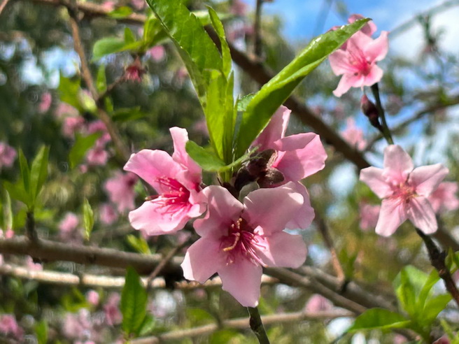 湖岸邊綠草如茵,一棵桃樹與一棵李樹在地面糾結,紅色的桃花和白色的李花則在空中交纏爭艷,也是難得一見的美景。
