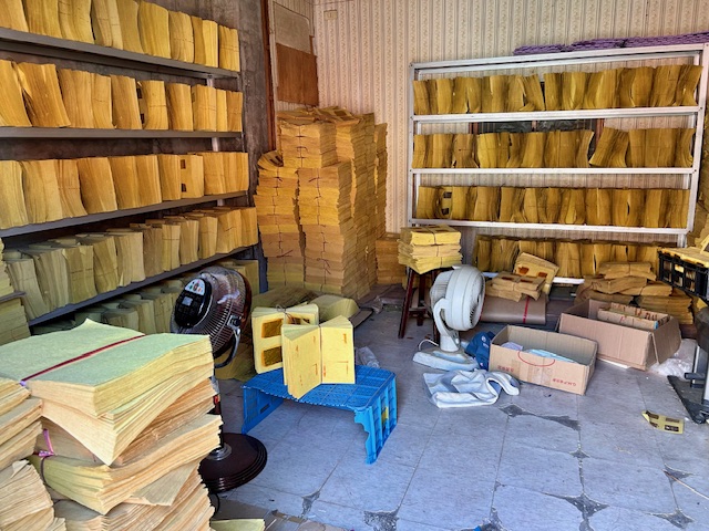 我們來到番社三十號的陳家古厝前,那是一棟傳統的閩南三合院,但門牆兩邊的空地上卻擺滿了一疊疊排列有序、似乎正在「曬太陽」的黃澄澄金紙。它提醒我們,這裡曾經是台灣生產金銀紙的重鎮,有過金色風華的歲月。