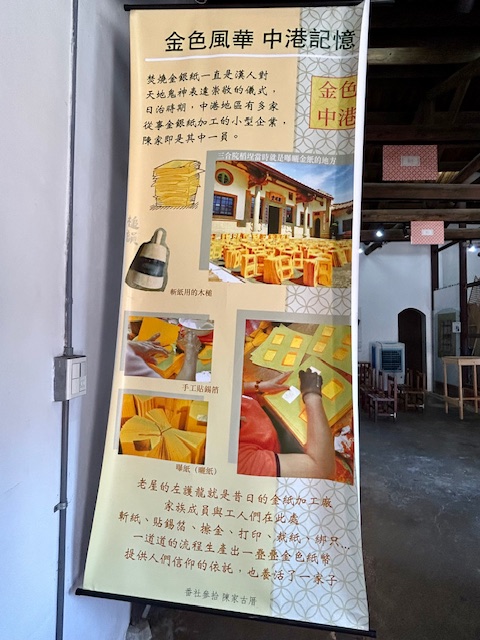 古厝的「穎川堂」是奉祀神明及祖先牌位的正廳,右廂的「新安軒」則是介紹中港金銀紙業歷史與實作的展場。