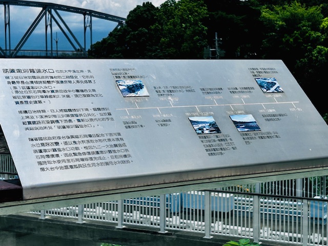 高台外緣的看板上有好幾張圖文並茂的看板,總標題是「葫蘆墩圳舊進水口」。既然說是「舊」,就表示有「新」的進水口。網路上說,1977年石岡水壩完工後,重新調整葫蘆墩圳的灌溉圳路,在食水嵙溪建新的進水口,但1999年921大地震後,石岡水壩嚴重毀損,葫蘆墩圳的新進水口塌陷,又緊急修復舊進水口應急。2004年,舊的進水口被登錄為歷史建築,不知道現在在進行的是什麼工程。
