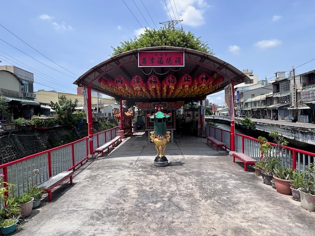 最後來到大鴛鴦汴水域,圳道竟然一分為二,中央出現一個小島,島上還有一座福德祠,那就是俗稱「水上土地公廟」的「角潭福德祠」。我們到福德祠參觀,看看兩邊洶湧的水流和圳外櫛比鱗次的住宅,感覺就像成語所說的「滄海桑田」,雖然其中有變與不變,但不管好壞,時代的洪流就這樣帶來了勢不可擋的改變。