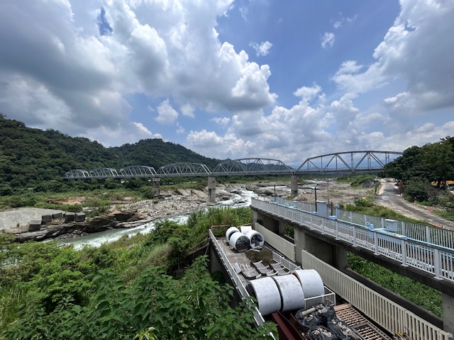站在大甲溪岸邊的高台上,看著遠方跨越大甲溪的舊山線鐵橋,還有近處水泥牆上標記的「葫蘆墩圳進水口」,高台下則有不少工程車、機具、水泥圓柱等,感覺這裡似乎正在進行什麼工程。