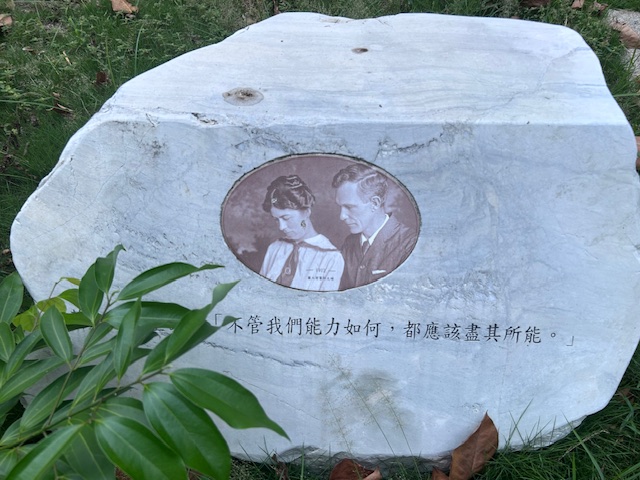 在離彰化基督教醫院不遠處中山路旁的成功公園圍牆邊,可以看到好幾幅「蘭大衛公共藝術」的看板,走進寫著「懷共生共好嘉惠社稷 擁切膚之愛奉獻台灣」對聯的公園入口,迎面就可看到一座石雕藝術作品: